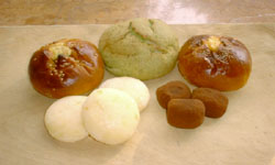 で、これがいただいたお土産です。上の真ん中にあるのが広島名産、高菜の入ったメロンパンです。高菜というからには塩辛いのかなぁ、って感じがしますが、さにあらず。甘くてさっぱりとしておいしいメロンパンでしたよ。 それから両脇にあるのが、中に高菜が入っていて、表面にちょっとマヨネーズを載せてこんがり焼いたパンです。お惣菜パンですね。これもとてもおいしかったです。(^^ それから手前向かって左手にあるのがミカンの入ったお餅。右手にあるのがチョコレート大福です。チョコレート大福はもっちりしっかりしていて、チョコモッチに通じるものがありました。友人にもお裾分けしたのですが、大変好評でした。ミカン餅は・・・、すいません、会長、東京におみやげに持っていこうとちゃんと封をし直して冷暗所に保管しておいたのですが、かびが生えてたらしくてお母んにさっさと捨てられてしまっていました。面目ないです。m(_ _)m